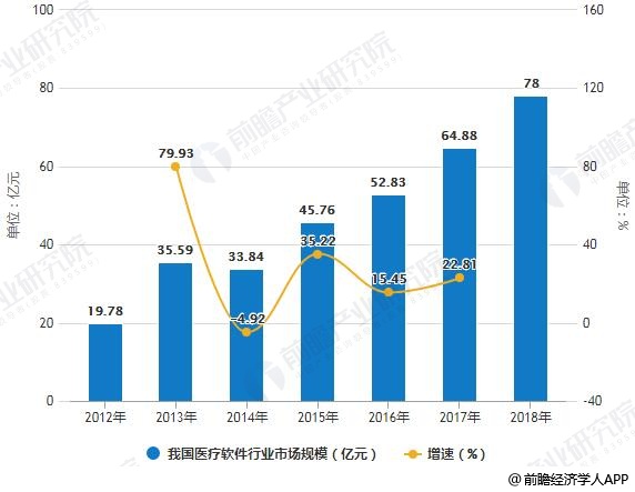 在技术及政策等多方支持下,2012-2017年,我国医疗软件行业的市场规模总体呈增加变动。作为医疗信息化的一个重要的子行业,医疗信息化的发展推动了医疗软件规模的增加。据前瞻产业研究院发布的《中国医疗软件行业发展前景预测与投资战略规划分析报告》统计数据显示,2012年我国医疗软件行业市场规模已达19.78亿元,截止至2017年我国医疗信息化行业的市场规模为达到448亿元,其中医疗软件和服务市场规模为126.8亿元,其中医疗软件行业市场规模为64.88亿元,较上年同比增加22.81%,增速保持在较高水平。初步测算2018年我国医疗软件行业市场规模将达到78亿元左右。