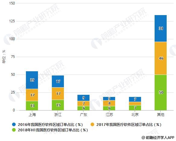 2016-2018年H1我国医疗软件区域订单占比统计情况