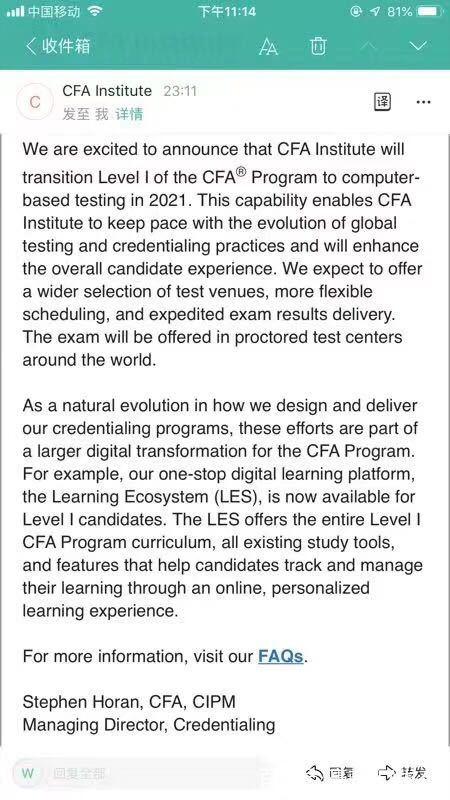 通过这封邮件,我们可以清楚的了解,从2021年开始CFA一级完全采用机考形式考试了,传统笔试从此“绝迹江湖”……