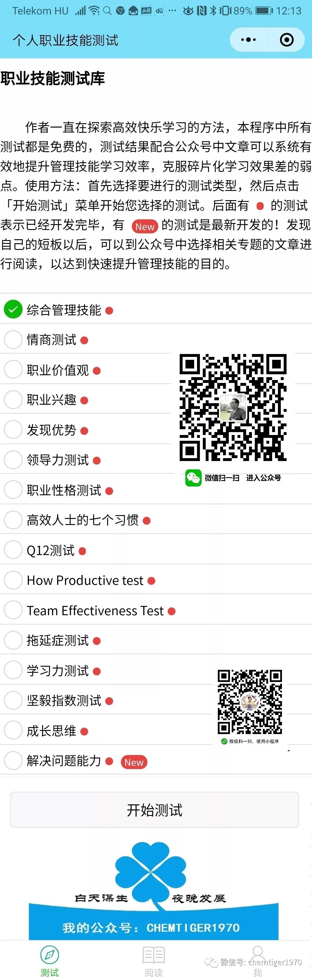 很多心理学家开发了各种职业测评工具,通过这些工具的分析,你可以更准确客观地快速了解自己。常见的测试工具有:职业兴趣、职业价值观、职业优势、职业性格、领导力测试等等,这些工具在我的小程序中都已开发完毕,完全免费,也不会记录测评的分析结果,为了节约篇幅,我就不再赘述。