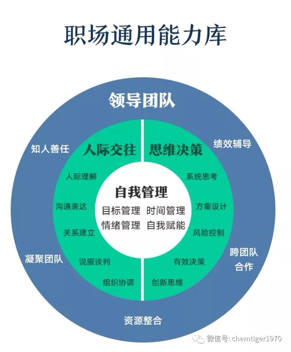 也可以把岗位基本胜任要求分为自我管理、人际交往、思维决策和领导团队四个纬度来修炼。自我管理,包括目标管理、时间管理、情绪管理和自我赋能等,是持续自我成长的关键,属于内圈;人际交往,包括人际理解、沟通表达、关系建立、说服谈判和组织协调;思维决策,包括系统思考、方案设计、风险控制、有效决策和创新思维等,属于中圈。领导能力,包括知人善任、凝聚团队、资源整合、跨团队合作和绩效辅导,进一步职场进阶需要影响他人,调动更多资源,属于外圈。