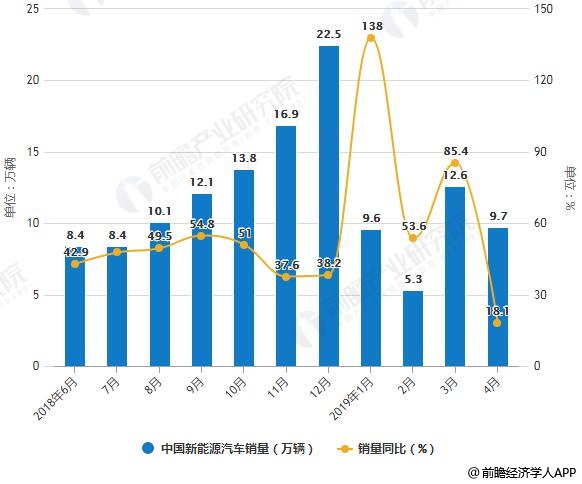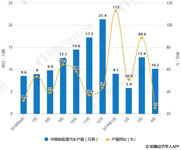 据前瞻产业研究院发布的《中国新能源汽车行业市场前瞻与投资战略规划分析报告》统计数据显示,2018年全年中国新能源汽车产销量达到了127万辆和125.6万辆,分别同比增长59.9%和61.7%。截止至2019年4月中国新能源汽车产销量为10.2万辆和9.7万辆,比上年同期分别增长25.0%和18.1%。累计方面,2019年1-4月中国新能源汽车产销累计达到了36.8万辆和36.0万辆,比上年同期分别增长58.5%和59.8%。