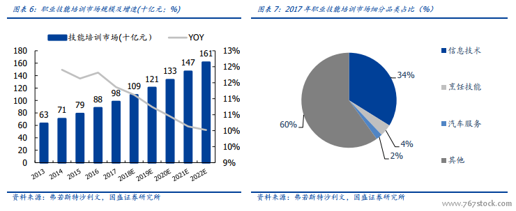 职业教育:受益高教及职业培训,产教融合增强就业竞争力。职业教育与普通教育相对应,是指对受教育者实施可从事某种职业或生产劳动所必须的职业知识、技能和职业道德的教育。若以《职业教育法》的适用范围定义,职业教育包括学历类职业教育(中等职业教育、高等职业教育)和非学历类职业培训(技能培训、从业资格培训、招录考试培训等),其中学历类职业教育归属教育部管辖,非学历职业培训归属人社部管辖。普通教育以研究型专业知识为目的,与之相对职业教育更侧重实用型技能培养,在课程制定上更贴近产业实操。