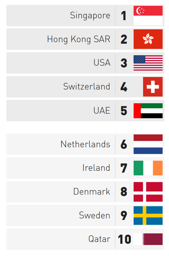 这与2018年的榜单明显不同。去年笑傲全球的冠军是美国,排第二位的是中国香港,新加坡为第三。