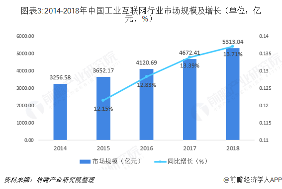 我国工业互联网在政策的推动下已经进入发展快车道,2014-2018年,中国工业互联网行业市场规模呈逐年增长趋势,增速保持在12%以上,且逐年递增。工业互联网发展越来越快,2018年,中国工业互联网行业市场规模约为5313.04亿元,较上年同比增长13.71%。
