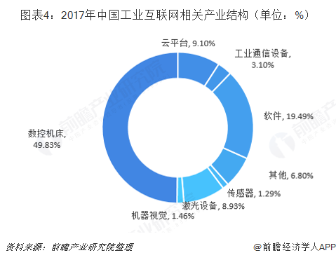 从依托于工业互联网平台而生的工业互联网相关产业结构来看,目前我国数控机床产业发展较为成熟,2017年数控机床产业市场规模达到2650亿,占工业互联网行业市场规模的49.83%;其次为工业软件,占工业互联网市场的19.49%;其他产业还处于雏形期或发展期,占比较小,但未来发展前景十分乐观。