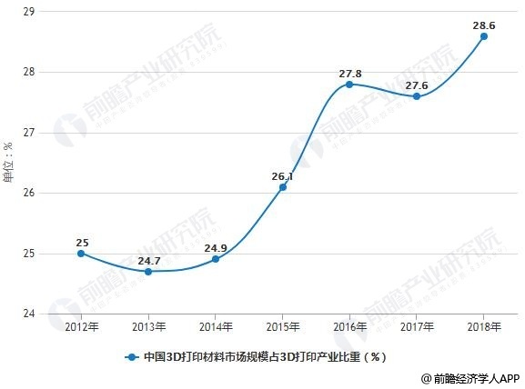 从3D打印材料市场规模占3D打印市场规模的比重来看,3D打印材料的比重逐渐上升,从2012年的25%上升至2017年的27.6%,预计2018年占比进一步增大,达到28.60%。市场比重不断增加,说明我国3D打印材料市场规模增速要稍快于我国3D打印市场规模增速,也侧面反映了3D打印材料产业在整个3D打印行业的地位愈发重要。