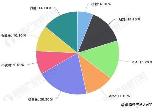 由于3D打印材料的下游应用主要为装备制造业,因此应用的3D打印材料主要为金属类材料,包括钛合金、铝合金、不锈钢及其他金属材料,金属类材料合计占比超过40%;另外,工程塑料ABS、尼龙、PLA等主流3D打印材料占比也在10%以上。