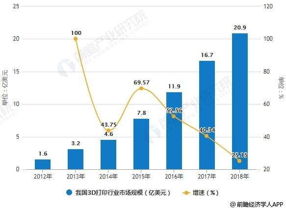 2012-2018年我国3D打印行业市场规模统计及增长情况预测