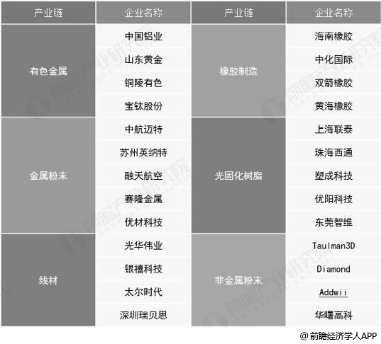 3D打印材料行业产业链各环节企业分析情况