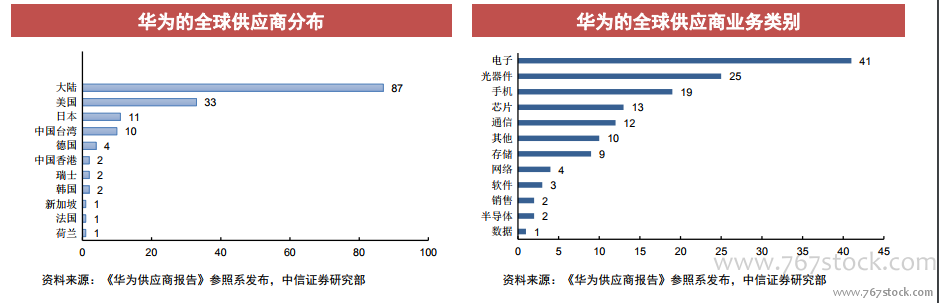 华为:19万员工,营收>1000亿美金(+17%),盈利>500亿元人民币。美国33家:Intel、高通、Skyworks、Avago等,CPU、射频芯片等高端元器件;德国4家:英飞凌、罗森伯格、罗德与施瓦茨等,网络设备的高端射频元器件;日本11家:村田、索尼、住友等,高端光通信元器件等;台湾10家:台积电、联发科、大力光、富士康等,设计、流片、封装等大规模产能 韩国2家:三星、SK海力士,存储元器件;大陆87家:深南电路、剑桥科技、鸿博股份、春兴精工、通宇通讯等,配套及代工。