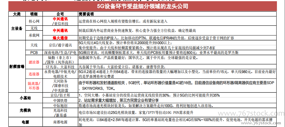 5G设备的投资策略是聚焦龙头找增量最大方向。2019年:5G“主题”逐渐落地,突破垄断环节、放量规模成为关注点。核心设备:技术升级+白盒化趋势,量价双升(天线、连接器、环形器),价值量提升(介质滤波器,PCB板),核心网和MEC:运营商引入新供应商,实时云化NFV。