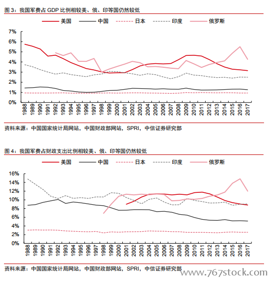 从军费支出占 GDP 及财政支出的比例角度看,我国军费仍存在较大提升空间。从军费占 GDP 及财政收入的角度看,我国军费尚存较大提升空间。2017 年我国军费占 GDP及财政支出的比重分别为 1.3%、5.1%,相较美国(3.1%、8.8%)、俄罗斯(4.3%、12.0%)、印度(2.5%、9.1%)的水平仍然较低。