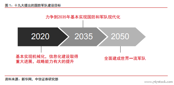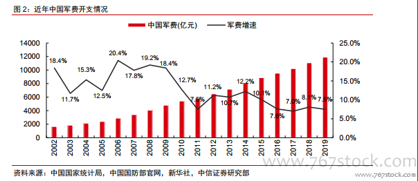 2019 年国防支出预算 11,899 亿元,同比增长约 7.5%,较 2018 年 8.1%增速略有下滑,但仍然保持着高于 GDP 增速的态势。从军费支出占 GDP 及财政支出的比例角度看,我国军费仍存在较大提升空间,且军费使用结构将不断优化,我们预计未来 5-10 年武器装备采购支出增速有望达到 10%-15%水平。为实现机械化、现代化建设目标,未来将加速补齐海、空军装备及信息化装备领域短板。