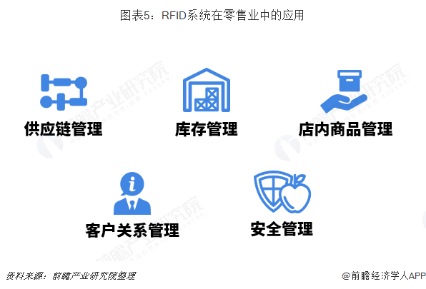 零售业中的RFID应用主要集中在供应链管理、库存管理、店内商品管理、客户关系管理以及安全管理五个方面。RFID有助于解决零售业两个最大的难题:商品断货和损耗(因盗窃和供应链被搅乱而损失的产品),据估计,RFID技术能够帮助把失窃和存货水平降低25%。