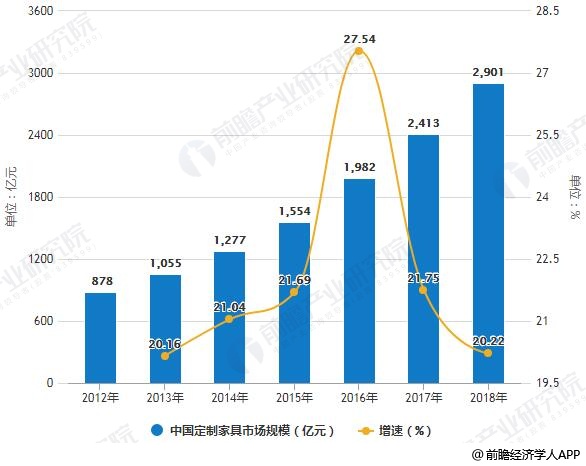 家具行业进入调整期,但定制家具市场规模却逆势增长。2018年中国定制家具市场规模约为2901亿元,较上年同比增长20.22%;近7年来,定制家具市场规模增速始终保持在20%以上。随着中产阶级的增加,越来越多的消费群体开始关注居家的整体生活艺术,旧式的成品家具已不能满足消费者对个性化生活的追求,人们更喜欢在居家生活中加入更多自主的创意与特色,这使得人们对定制家具的需求呈现上升趋势。