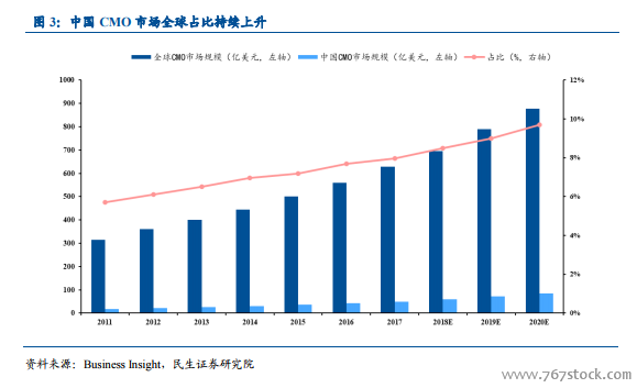 工程师红利+中国市场红利,是国内医药外包行业两个不一样的驱动因素。产业链转移:药物发现 CRO 产业转移趋于成熟,CMO 仍处于产业转移初期。在过去的 20 年中,基于中国的工程师红利,医药外包行业呈现向新兴市场转移的趋势,特别是研发早期的外包需求,转移趋势明显。其中,非监管领域的早期药物发现 CRO 产业转移较早,节奏较快。目前,国内的药明康德和康龙化成已经是全球药物发现 CRO 体量第一和第二的企业,发展阶段也趋于成熟。而 CMO 领域涉及到 cGMP 的监管,仍处于产业转移的早期,Business Insight 数据显示,2011-2017 年间,中国 CMO 市场规模全球占比从不足 6%上升到了 8%,预计 2020 年将达到 9.7%。