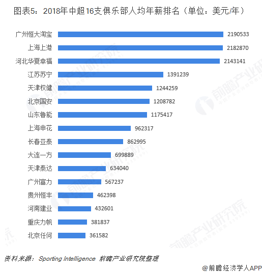 此外,中国足球球员薪资水平过高,也拖累了俱乐部的发展。根据Sporting Intelligence数据,中超球员平均薪资高达105万美元,在世界足球联赛中仅次于英超、西甲、意甲、德甲和法甲这五大联赛,远高于日本J联赛(31.5万美元)、韩国K联赛(13.3万美元)薪酬水平。中超16支球队中,广州恒大淘宝以219万美元的平均年薪位居榜首。