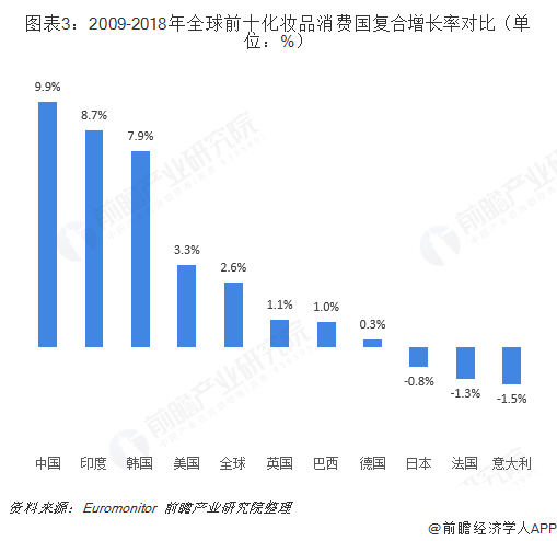 从增速角度对比,中国、印度、韩国等新兴市场在过去十年内引领全球增长,而日本、法国、意大利等成熟市场出现负增长。中国作为全球化妆品市场发展规模年均增速最快的国家,2018年全国化妆品限额以上单位商品零售额为2619亿元,同比增长9.6%,仍显著高于同期全球增速。