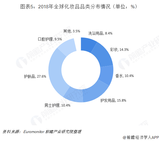 分品类来看,护肤品仍是化妆品中的第一大品类,2018年占比达到27.6%,其次是护发用品,占比15.8%;彩妆、香水、男士护理占比也都超过10%,分别达14.3%、10.4%、10.4%;其余品类比重则在10%以下。