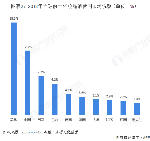 分国家来看,2018年,全球前十化妆品消费国依次是美国、中国、日本、巴西、德国、英国、法国、印度、韩国和意大利。其中,美国是全球最大的化妆品消费国,市场占比达18.3%,中国市场份额也超过10%。