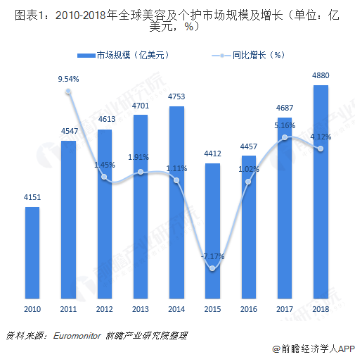 2010-2015年,全球经济放缓导致化妆品市场规模增速明显走低,2015年甚至出现负增长的情况,原因是欧元区需求不振及南美经济出现严重下滑。2016年以后,全球化妆品市场迎来触底反弹,扭转了此前的发展颓势。根据Euromonitor数据统计,2018年,全球美容及个护市场规模达4880亿美元,同比增长4.12%,创下五年来最好表现。