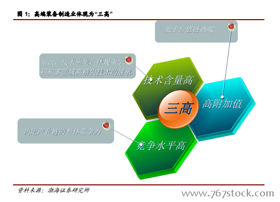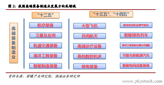 高端装备制造业的主要发展领域。为加强我国高端装备制造业,2012 年 5 月,工信部印发《高端装备制造业"十二五"发展规划》,提出"十二五"期间,高端装备制造业发展的重点方向主要包括航空装备、卫星及应用、轨道交通装备、海洋工程装备、智能制造装备五个方面。2015 年 5 月,国务院发布《中国制造 2025》,作为国家实施制造强国战略的中长期行动纲领。《中国制造 2025》明确将高端装备创新工程作为五大工程之一,并对高端装备的发展方向进行了进一步细化,即要集中资源,着力突破大型飞机、航空发动机及燃气轮机、民用航天、先进轨道交通装备、节能与新能源汽车、海洋工程装备及高技术船舶、智能电网成套装备、高档数控机床、核电装备、高性能医疗器械、先进农机装备等一批高端装备,满足我国经济社会发展的重大需求,在国际市场占据一席之地。