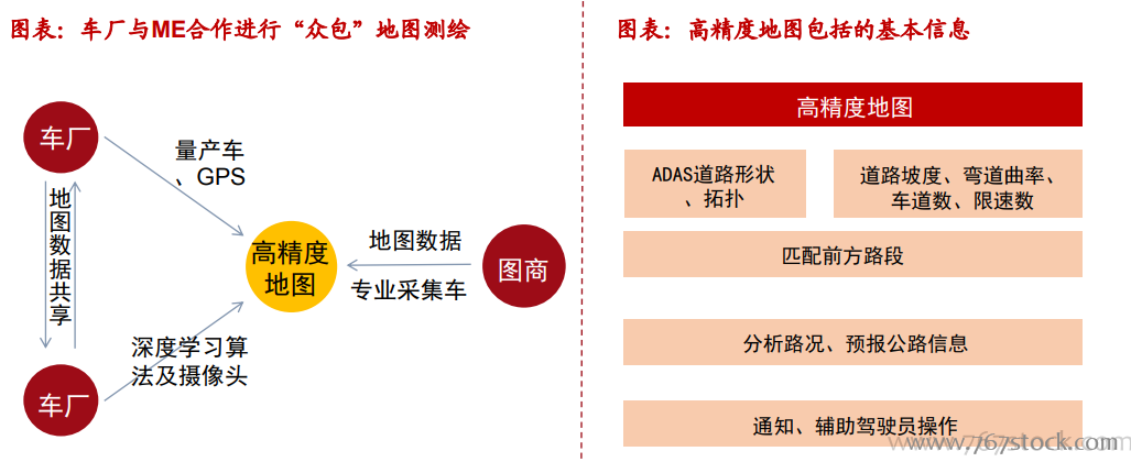 四维图新:高精度地图。高精度地图的测绘要复杂得多。目前市场上高精度地图的制作主要包括采集车测绘、“众包测绘”两种模式。传统技术图商在硬件、数据及技术积累上有绝对的优势,主要采用采集车绘制,精度较高。各大车厂拥有海量的普通汽车,主要采用“众包测绘”的方法。四维图新目前和Google一样以采集车测绘为主,未来将采用“众包”和采集车相结合的模式。