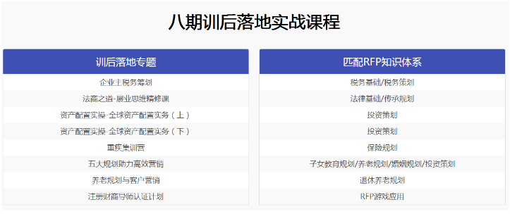 RFP课程除了金融理财领域的专业知识,金融人的职业道德和行为操守也得到强调。在专业知识领域,RFP拥有一套完善的知识体系,包含基础财务策划、投资策划、保险及退休策划、税务及遗产策划、高级财务策划五大模块及由此延伸出来的针对不同行业的实战落地课程,内容涵盖产品、法律、税务、投资、保险、遗产策划等方面,全面涵盖专业理财师在为客户提供理财方案时所需要的知识。学习之后,能够帮助学员体系化掌握理财规划所涉及的各个环节,并能根据不同客户群体的需要,度身定制专属于客户的产品,真正帮助客户实现财产“保值、增值、保全”的功能。