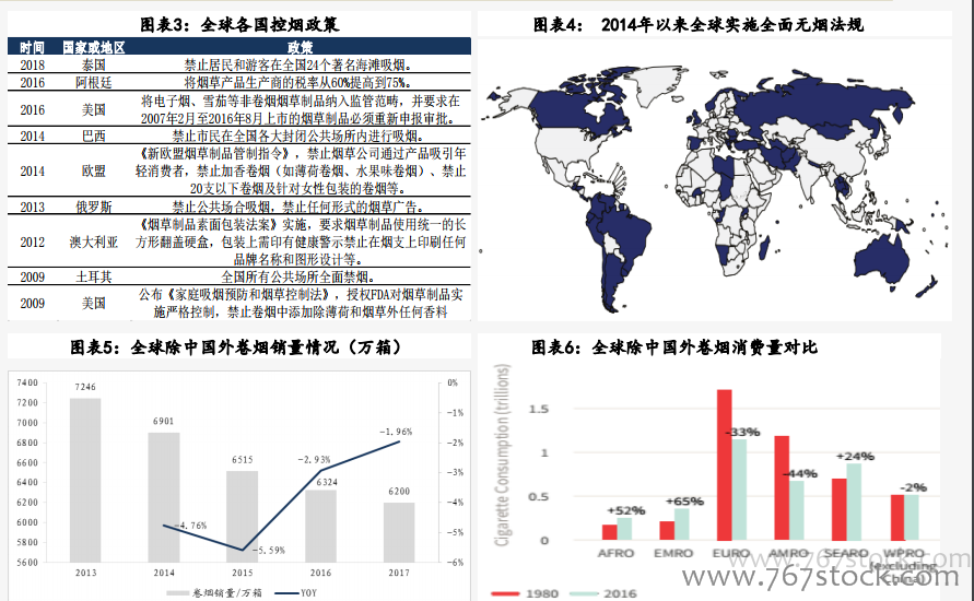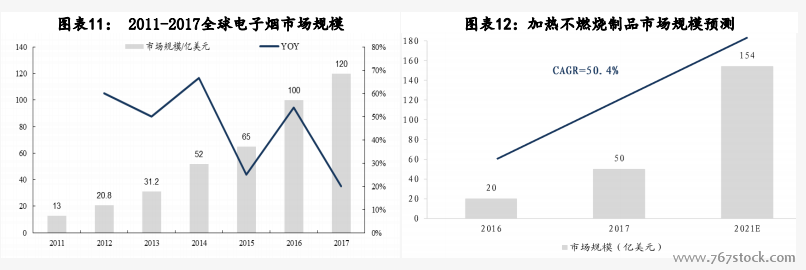 新型烟草市场高速成长:根据世界烟草报告,2017年全球新型烟草制品市场规模约290亿美元,同比增长27.2%。传统电子烟收入120亿美元,同比增加20%。加热不燃烧制品收入50亿美元,同比增加176%。无烟气烟草制品收入120亿美元,与上年同期基本持平。