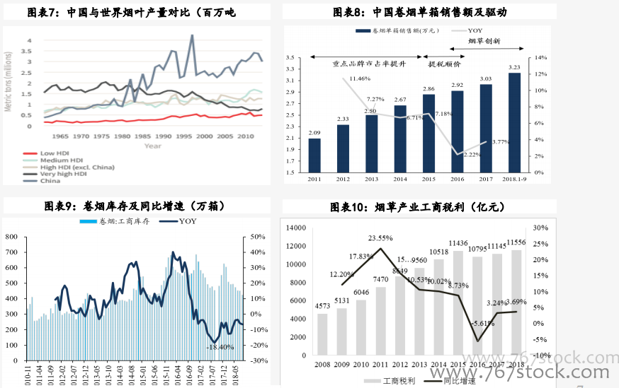 中国烟草实行专营,处于补库上行周期。中国是烟草最大的消费市场,实行专营:无论是烟民数量、烟民消费位居世界第一(占比全球卷烟规模43%的市场份额);截至2015年烟民数量达近3亿(4700万大箱)。去库存任务基本完成,已经迎来行业补库:受到提税顺价+清理库存影响,15-16年我国烟草行业迎来史上最弱周期;去库任务基本完成,行业迎来复苏周期。2018前三季度销量同比升1.45%;卷烟产品未来的发展趋势在细支烟、爆珠烟等烟草纸品的结构升级。