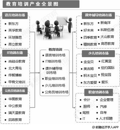 中国教育培训市场形成了新东方、好未来、昂立、北大青鸟、新华等知名企业,并在市场细分上逐渐形成语言、IT、企业、少儿、公务员、研究生等相应的培训服务市场,国内培训企业从单一的技能教学向综合化培训教育集团企业发展,与国外培训机构形成竞争。此外,在线教育也正在蓬勃发展。
