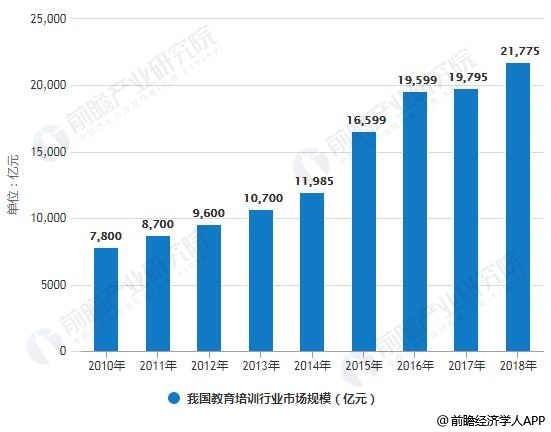 据前瞻产业研究院发布的《中国教育培训行业市场前瞻与投资战略规划分析报告》统计数据显示,经历一番整合后,我国教育培训行业市场规模也逐渐稳定在2万亿元左右。2010年我国教育培训行业市场规模已达7800亿元,2013年我国教育培训行业市场规模突破万亿元。2015年之后又一轮爆发式增长。截止至2017年我国教育培训行业市场规模增长至19795亿元,初步测算2018年我国教育培训行业市场规模将突破2万亿元,达到21775亿元。