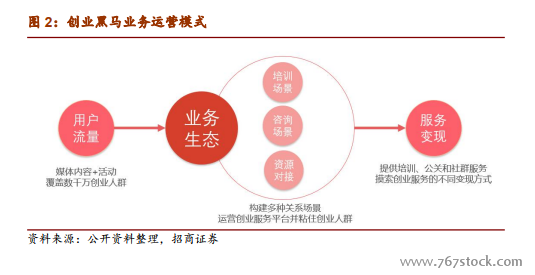 企业培训咨询服务平台业务全方位开展,服务变现形成闭环。在创办期刊的过程中,牛文文发现大多数创业家及中小企业家在创业及企业发展过程中对辅导培训都有较大需求,因此逐渐萌生了让老一代的企业家给新一代的创业者“上课”的想法。2010 年 10月,《创业家》成立了黑马营,正式开启班级式的培训,随后创业黑马推出了包括黑马大赛、i 黑马网、黑马会、创业家 app、百城计划、独角兽加速计划在内的多个企业服务品牌。目前针对培训服务产品,公司进行生命周期的再定位,由创业辅导培训向孵化服务方向过渡,以早期“创业实验室—导师营”的架构为基础,更新迭代到以导师 IP内容为核心的“实验室”培训辅导产品,丰富了产品内容。同时结合自身媒体端服务优势,借助“创业家”、“i 黑马网”、“黑马学吧”及产业垂直号等资讯服务品牌,在微博、微信及 APP 等 PC 端和移动端的主要传播服务平台提供营销传播服务,吸引了大量用户流量,促进自线上传播到线下活动的联动和转化,完成了其从传统纸媒到中小及创新创业企业服务提供商的转变。