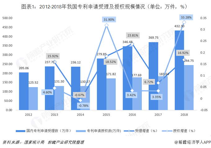 在专利方面,2018年,我国国内专利申请量首次突破400万件,达432.30万件(不含PCT国际专利申请和专利复审),同比增长16.92%;专利申请授权数达244.75万件,同比增长33.28%。总体来看,专利增量明显。