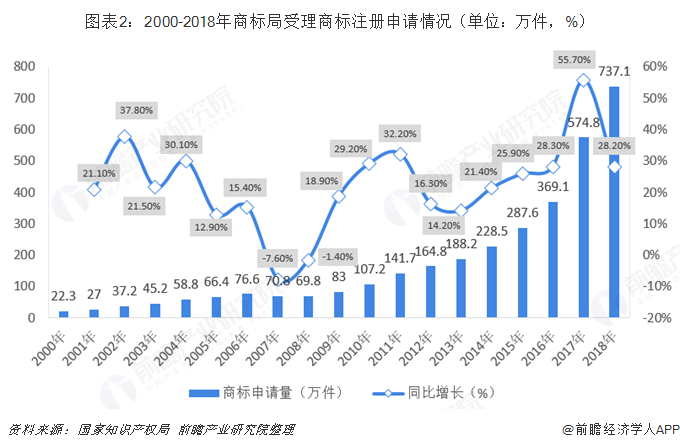 在商标方面,受官费下调、新一轮商标注册改革的影响,继2017年我国商标申请量(574.8万件)实现爆发式增长后,2018年,我国商标申请量延续爆发式增长态势,全国商标注册申请量达737.1万件,同比增长28.20%,较2017年略有放缓,但是仍保持着高速增长态势,增速高于2015年水平。从这个意义看,商标申请增速略有放缓。