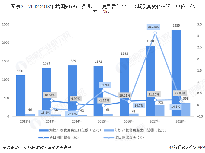 2018年,我国知识产权进出口使用费进口2355亿元,增长22.03%,出口368亿元,增长14.3%。我国知识产权使用费出口额的增长,是我国实施创新驱动发展战略、不断强化知识产权创造、保护、运用的重要体现,也是我国创新主体知识产权能力不断提升的重要风向标