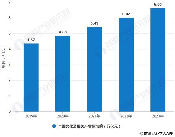 据相关数据显示,预测2019年全国文化及相关产业增加值将达到4.37万亿元,2022年全国文化及相关产业增加值将突破了6万亿元,并预测在2023年全国文化及相关产业增加值将增长至6.65万亿元,2019-2023年均复合增长率约为11.07%。