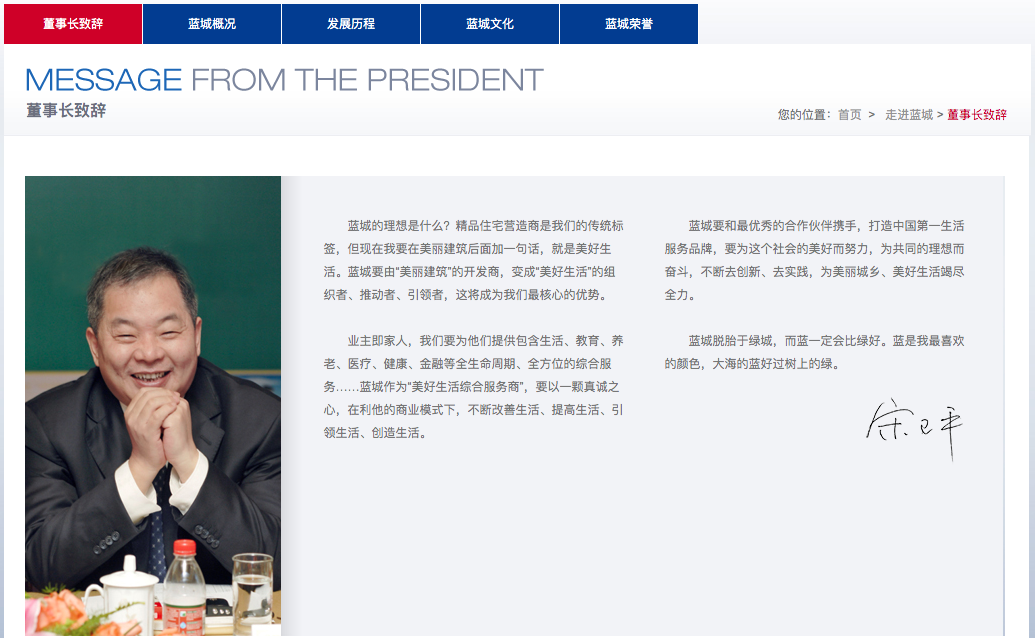尽管担任绿城董事会联席主席,但宋卫平现在已经把大量精力放在了蓝城集团身上。“蓝城脱胎于绿城,而蓝一定会比绿好。蓝是我最喜欢的颜色,大海的蓝好过树上的绿”。在新蓝城的官网上,宋卫平的期待之语赫然在列。