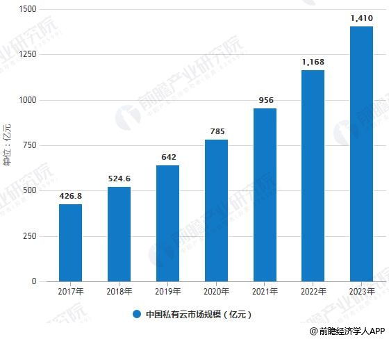 据相关数据显示,2017年中国私有云市场规模达到426.8亿元,同比增长23.8%。初步测算2018年中国私有云市场规模将达到524.6亿元,同比增长22.9%。预测2019年中国私有云市场规模将达642亿元,2022年中国私有云市场规模将突破千亿元,并预测在2023年中国私有云市场规模将增长至超1400亿元,达到了1410亿元,2019-2023年均复合增长率约为21.74%。