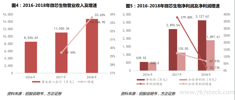 西达本胺上市后快速增长,公司业绩稳步攀升。2016年起,西达本胺销售持续快速增长,拉劢微芯生物收入规模持续扩大,营业收入呈现稳定快速成长:公司2016-2018年收入分别为8,536、11,050、14,769万元,连续三年较同期增长均在30%左右;净利润分别为540万元、2,591万元、3,128万元,三年时间净利润规模扩大五倍;扣非后归母净利润分别为503万元、1,130万元、 1,897.61万元,2018年较2017年和2016年同期大幅提高。公司净利润由2016年的6.32%提升到2018年的21.18%。