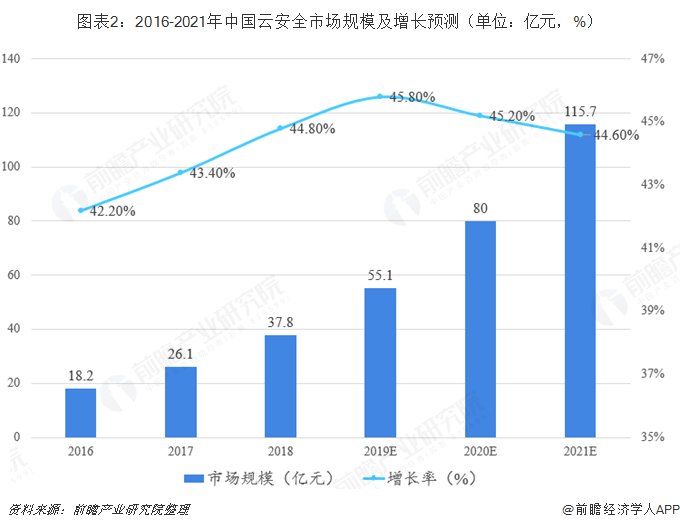 我国云计算在技术方面逐渐走向成熟,步入产业发展繁荣期。云计算的进步带动无服务器计算发展,将引发新的网络信息安全问题。攻击者更容易借无服务器计算隐藏活动踪迹制造网络威胁。这些威胁同时也将为未来云安全与服务的研发与部署提供广阔的应用场景。虽然中国云安全市场目前处于起步阶段,但整体市场规模将随着云计算市场规模的增长而快速崛起。2018年中国云安全市场规模达到37.8亿元,同比增长44.8%,未来3年预计将继续保持每年40%以上的高速增长。