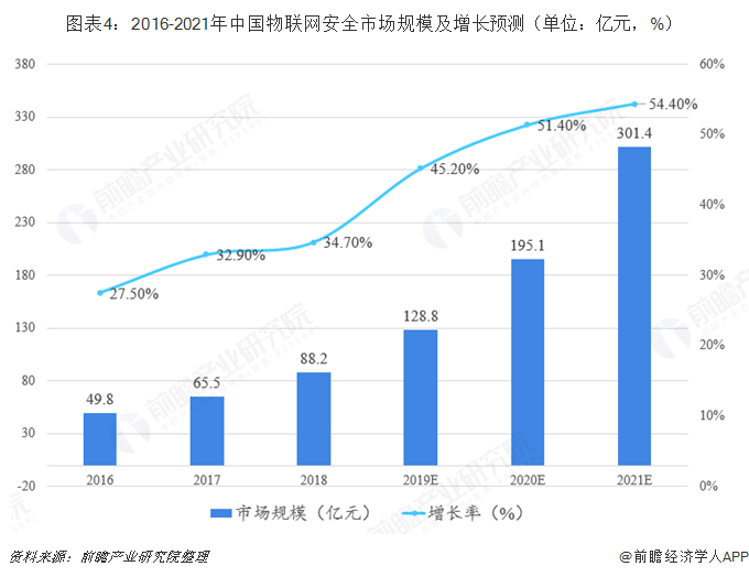 万物互联的大趋势下,物联网市场规模将进一步扩大,相应的设备、网络、应用也面临严峻的安全挑战。根据赛迪顾问《2019中国网络发展白皮书》统计数据,2018年我国物联网安全市场规模达到88.2亿元,同比增速达34.7%,预计未来几年增速将持续保持上升,至2021年达54.4%,市场规模突破300亿元。物联网既是网络安全的重灾区,也将促使物联网安全行业成为万亿规模市场下的蓝海“潜力股”。