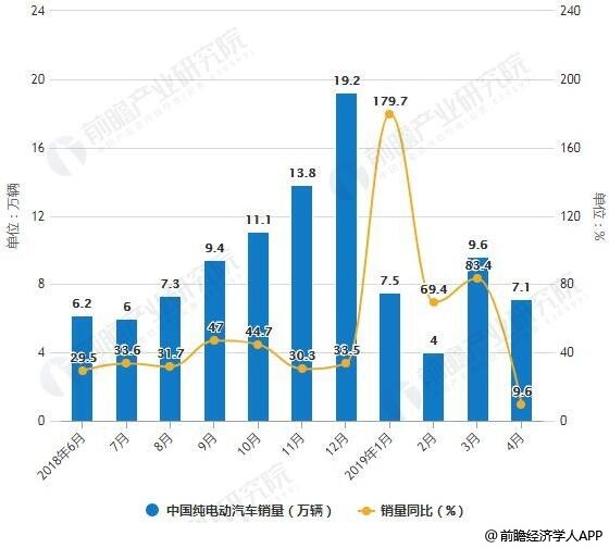 在纯电动汽车产销方面,2018年全年中国纯电动汽车产销分别完成98.6万辆和98.4万辆,比上年同期分别增长47.9%和50.8%。截止至2019年4月中国纯电动汽车产销量分别完成8.2万辆和7.1万辆,比上年同期分别增长28.2%和9.6%。