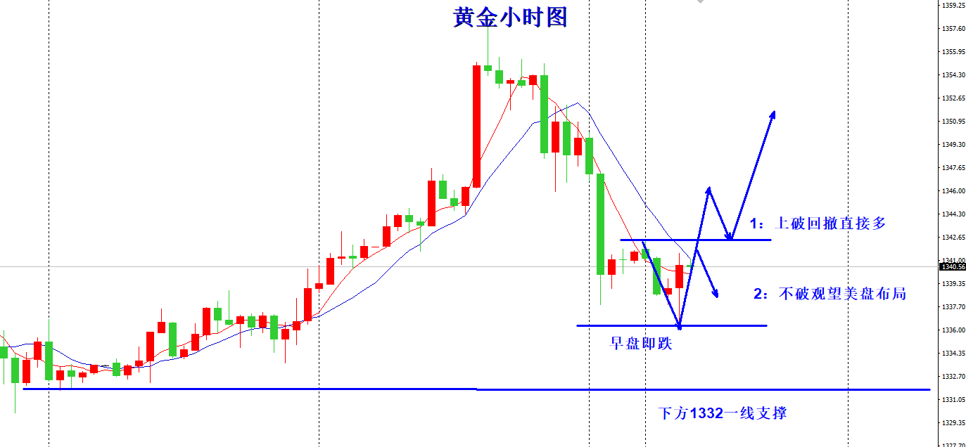 目前黄金还是需要等待,等待欧盘尾盘或者是等待欧盘时间,看看欧盘能否上破1342.5,如果上破1342.5那么可以回撤做多,行情就发展为早盘急跌不延续,欧盘反弹破位跟多,这是一个进场点位,再者就是等到美盘前回撤进场多单。如果欧盘不上破1342.5,下方也没有破位早盘的低点,那么美盘当做震荡行情处理即可。