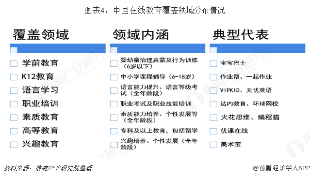 中国在线教育目前覆盖七个领域,既有专门针对不同年龄段的各种阶段教育平台(学前教育、K12教育),也有适用于全年龄段的(语言学习、职业培训等等)。