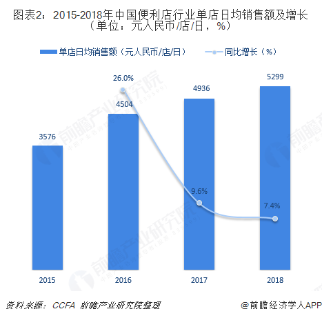 根据CCFA数据统计,2018年,中国便利店实现销售额2264亿元,同比增速18.8%,继续维持两位数增长。从便利店日均销售额来看,2017年,单店日均销售额达到5299元人民币/店/日,同比增长7.4%。