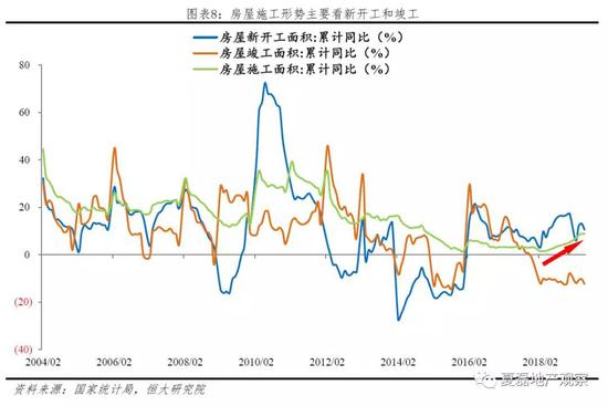 当前的施工面积提速,主要有三方面原因:一是2018年拿地高峰进入集中开发阶段;二是去年底今年初宽货币向宽信用传导、部分城市调整调控措施,带动年初销售增速回升,房企加快开工、复工以配合销售;三是2015-2016年牛市中销售的期房临近交房期,竣工自2018年10月以来总体改善。