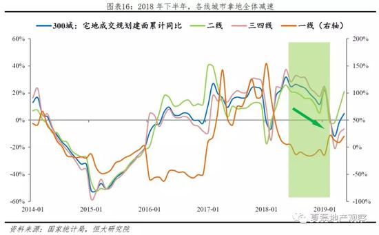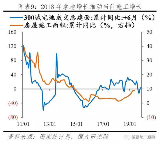 从领先指标来看,2018年拿地高峰进入开工、施工期,推动投资走强。2015-2018年,土地成交增速持续提升,2015年2月,300城住宅用地成交规划建筑面积累计同比下降52%,之后不断回升,在2018年5月达到32%的增长高点。2018年,300城宅地成交建面9.1亿平,创2014年以来新高。这部分新供给土地,在2018H2-2019H1集中进入开发阶段。
