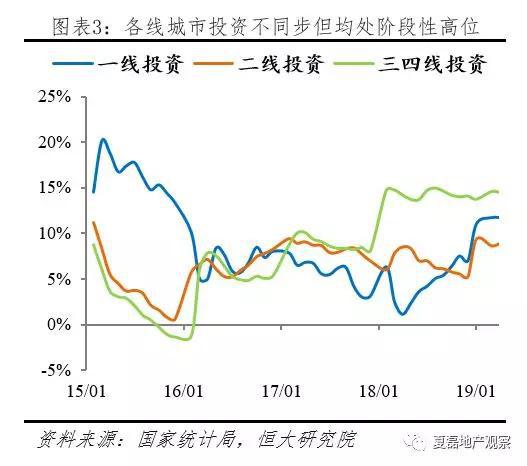 分地区看,当前的投资强劲,主要是一二线投资大幅提速,三四线仍处高位。一线、二线、三四线城市的投资额占全国的比重,保持1:4:5的结构,2014-2018年,一线城市平均占比11%、二线城市42%、三四线城市47%。2019年1-4月,一线城市投资同比增长11.7%,增速较2018年提高4.7个百分点;二线城市增长8.9%,提高3.6个百分点;三四线城市增长14.5%,提高0.4个百分点。